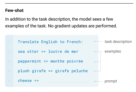 - Few-shot은 프롬프트에 추가적인 설명 예제 n개와 함께 문제를 해결하려는 세팅이다.