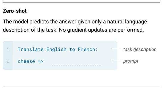 - Zero-shot은 프롬프트에 추가적인 설명 예제 없이 바로 문제를 해결하려는 세팅이다.