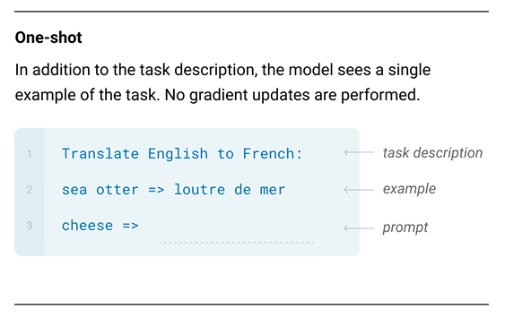 - 즉, 설명만 하는 Zero-shot과 다르게, 한 개의 예시를 추가해 모델이 더 쉽게 패턴을 이해하도록 한다.